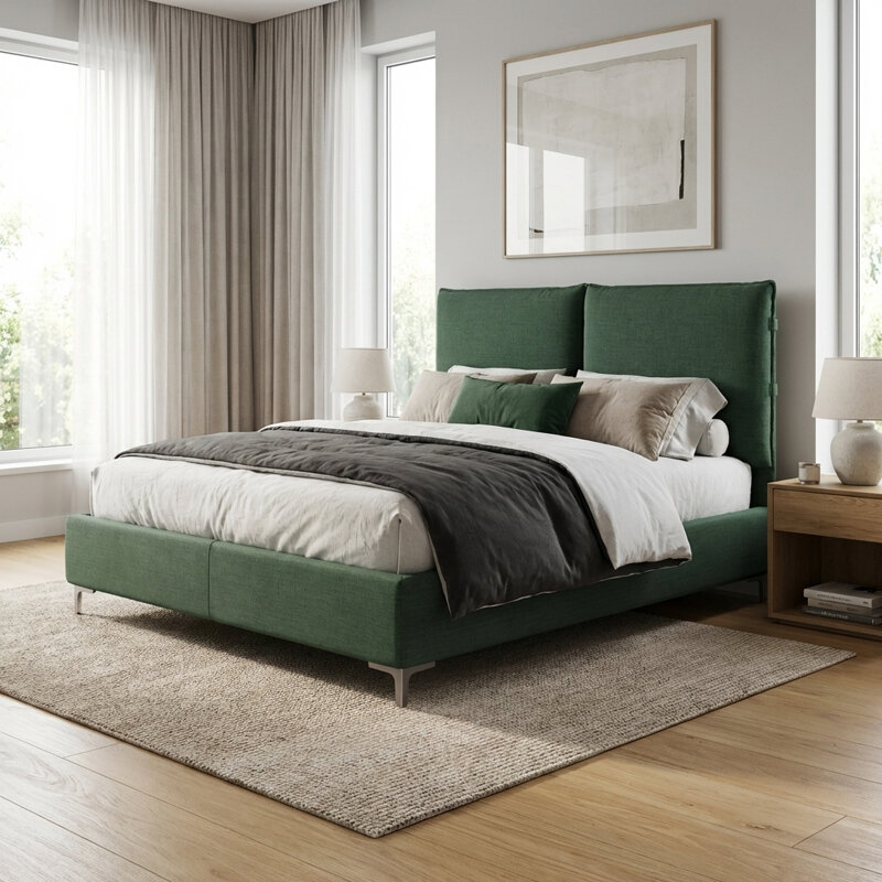 Unisce l'estetica naturale del verde bosco alla massima funzionalità domestica. Questo letto è progettato per chi desidera un ambiente notte ordinato senza rinunciare a un design moderno e accogliente. Si distingue per il suo design minimalista e la testiera generosamente imbottita, ideale per chi cerca un equilibrio tra comfort e stile contemporaneo nella propria zona notte.